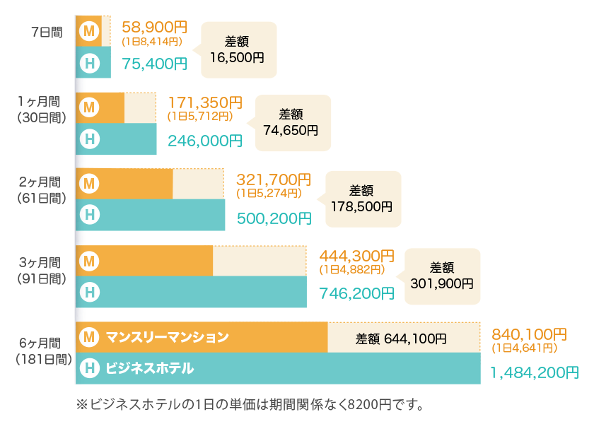 1週間程度の利用であればビジネスホテルと費用面では大差がありませんが、1週間以上の利用になってくるとメリットが出てきます。
