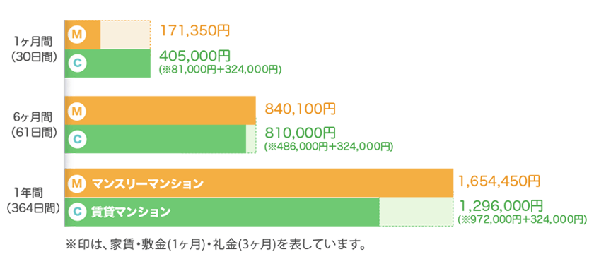 ※マンスリーマンションは、光熱費・火災保険全て込みです。 ※一般賃貸マンションは、2年未満の契約の場合、違約金がかかる場合もあります。